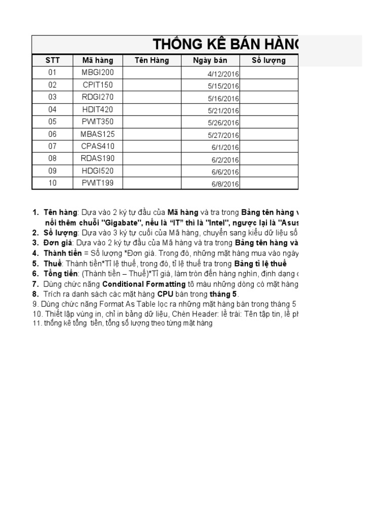 1. Tên hàng: Dựa vào 2 ký tự đầu của Mã hàng và tra trong Bảng tên hàng và đơn giá. Trong đó, nếu 2