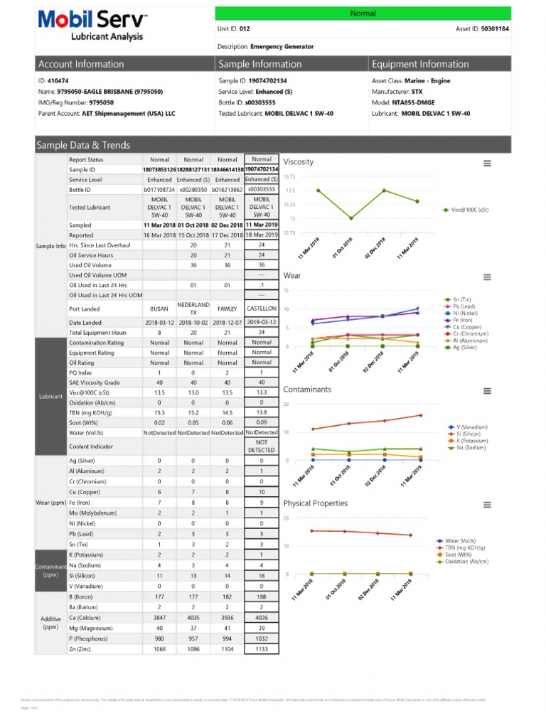 NO ACTION REQUIRED ON OIL OR ENGINE. Results indicate that all levels ae within acceptable ranges. Examine progressive changes and
