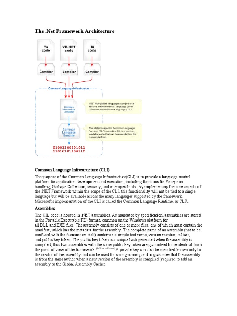 Common Language Infrastructure (CLI) The purpose of the Common Language Infrastructure(CLI) is to provide a language-neutral platform for application development and execution, including functions for Exception handling, Garbage Collection, security, and interoperability. By implementing the core aspects of the .NET Framework within the scope of the CLI, this functionality will not be tied to a single language but will be available across the many languages supported by the framework. Microsoft's implementation of the CLI is called the Common Language Runtime, or CLR. Assemblies The CIL code is housed in .NET assemblies. As mandated by specification, assemblies are stored in the Portable Executable(PE) format, common on the Windows platform for all DLL and EXE files. The assembly consists of one or more files, one of which must contain the manifest, which has the metadata for the assembly. The complete name of an assembly (not to be confused with the filename on disk) contains its simple text name, version number, culture, and public key token. The public key token is a unique hash generated when the assembly is compiled, thus two assemblies with the same public key token are guaranteed to be identical from the point of view of the framework.[dubious discuss] A private key can also be specified known only to the creator of the assembly and can be used for strong naming and to guarantee that the assembly is from the same author when a new version of the assembly is compiled (required to add an assembly to the Global Assembly Cache).