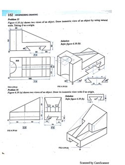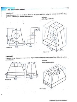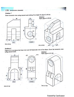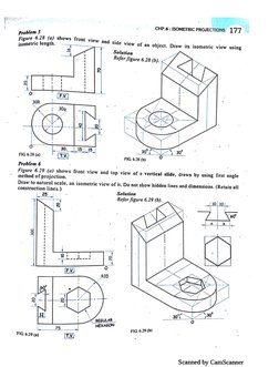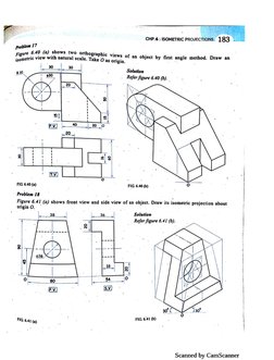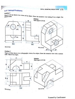 Solved Problems on Isometric Projections: Contains a series of solved problems demonstrating isometric projection techniques and solutions. Exercise Section: Isometric Drawing: Unsolved exercise section allowing users to practice their isometric drawing skills based on orthographic projections provided. cche.6 : SoMETmC mos 175 oe