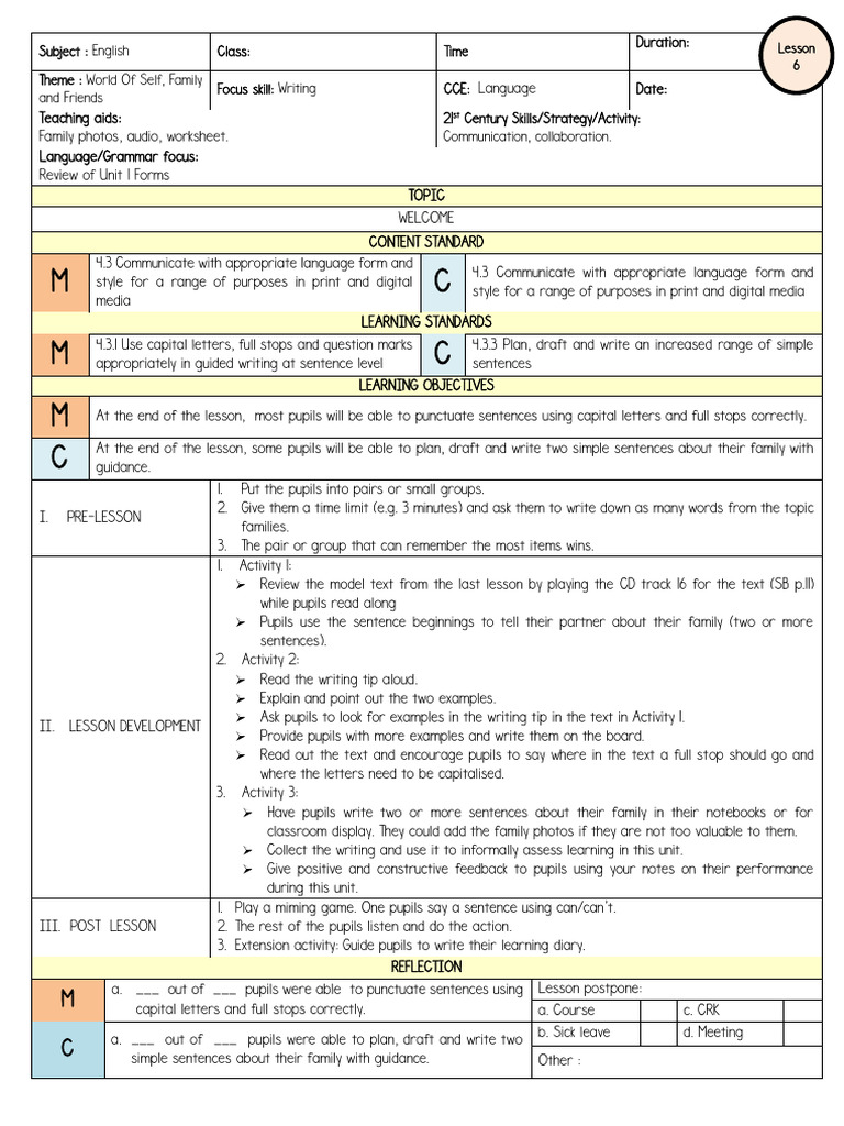 M At the end of the lesson, most pupils will be able to punctuate sentences using capital letters and full stops correctly.