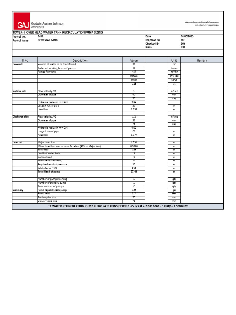 TOWER-1_OVER HEAD WATER TANK RECIRCULATION PUMP SIZING