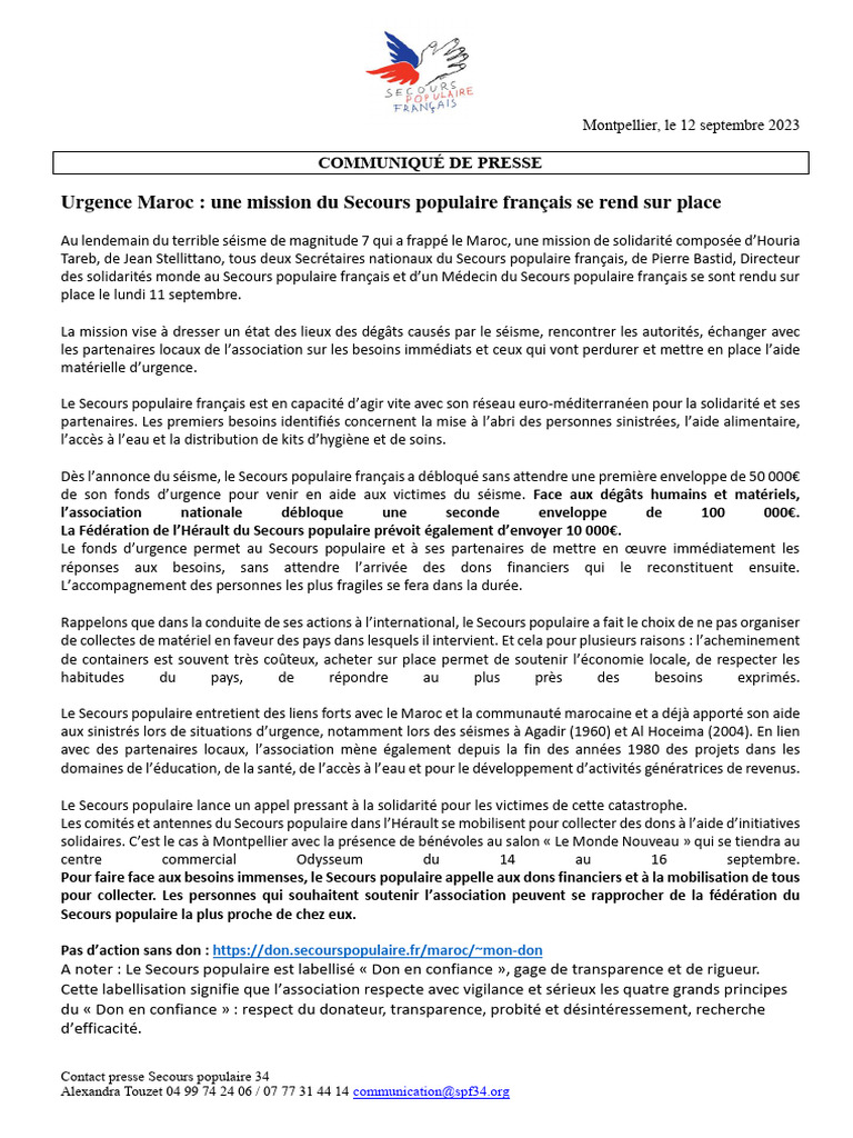 Le Secours populaire entretient des liens forts avec le Maroc et la communauté marocaine et a déjà apporté son aide