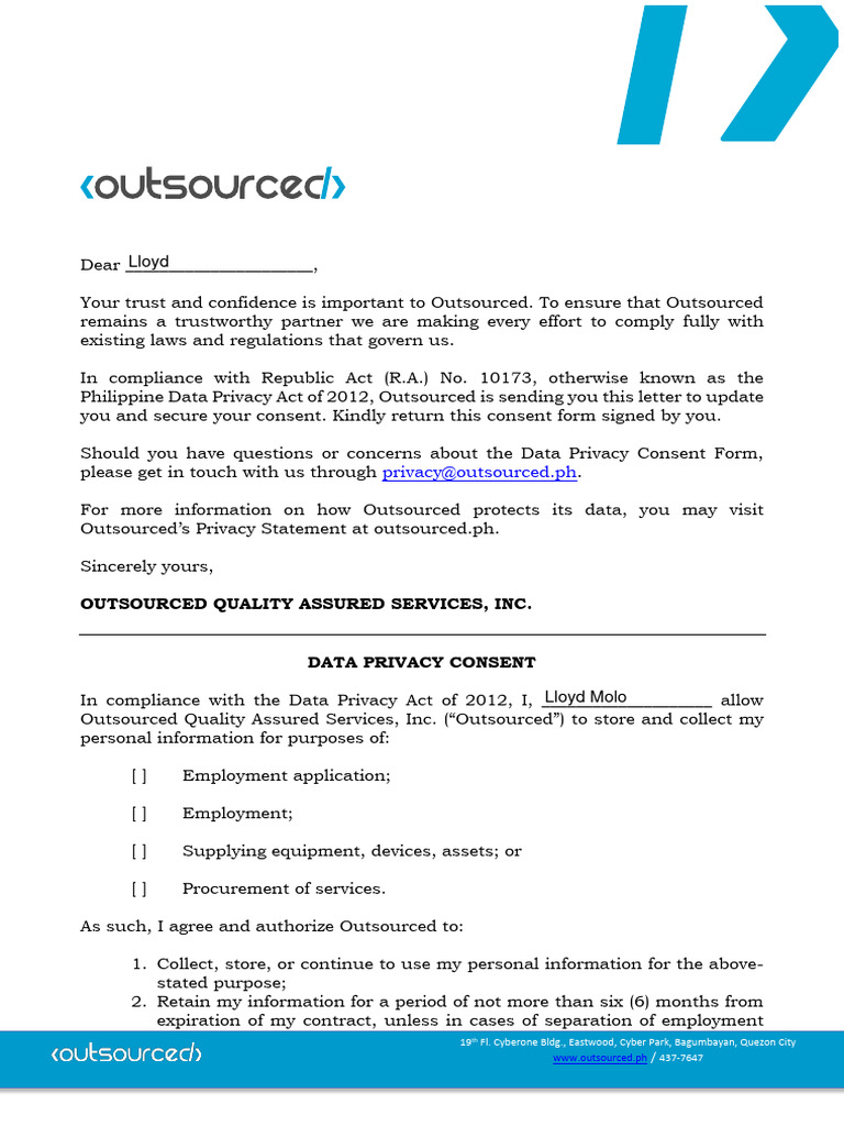 Philippine Data Privacy Act of 2012, Outsourced is sending you this letter to update