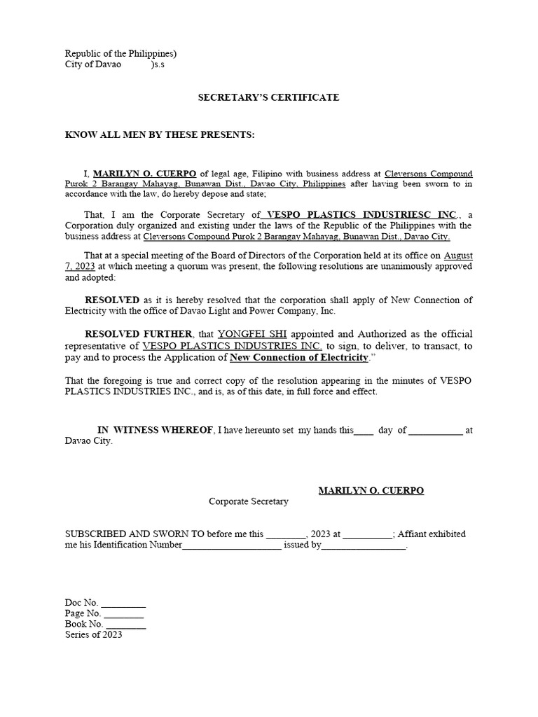 That, I am the Corporate Secretary of VESPO PLASTICS INDUSTRIESC INC., a
