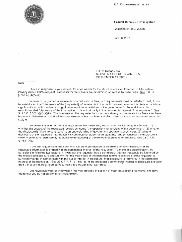 Dear This is in response to your request for a fee waiver for the above referenced Freedom of Information Privacy Acts (FOIPA) request. Requests for fee waivers are determined on a case by case basis. See 5 USC 552 (a)(4)(A)(iii) . In order to be granted a fee waiver or a reduction in fees, two requirements must be satisfied. First, it must be established that "disclosure of the (requested] information is in the public interest because it is likely to contribute significantly to public understanding of the operations or activities of the government." Second , it must be established that "disclosure of the information ... is not primarily in the commercial interest of the requester." See 5 US .C 552(a)(4)(A)(iii) . The burden is on the requester to show the statutory requirements for a fee waiver have been met. Where one or both of these requirements has not been satisfied , a fee waiver is not warranted under the statute . To determine whether the first requirement has been met, we consider the following four factors : (1) whether the subject of the requested records concerns "the operations or activities of the government ;" (2) whether the disclosure is "likely to contribute" to an understanding of government operations or activities ; (3) whether disclosure of the requested information will contribute to "public understanding;" and (4) whether the disclosure is likely to contribute "significantly" to public understanding of government operations or activities . See 28 CFR. 16.11 (k)(2). if 'the first requirement has been met, we are then requirec to determine whetr:er disclcsure of the requested information is primarily in the commercial interest of the requester. To make this determination, we consider the following two factors : (1) whether the requester has a commercial interest that would be furthered by the requested disclosure and (2) whether the magnitude of the identified commercial interest of the requester is suffiCiently large, in comparison with the public interest in disclosure, that disclosure is "primarily in the commercial interest of the requester." See 28 C.F.R. 16.11 (k)(3) If the requester's commercial interest In disclosure is greater ., then the public intere~t to be served, then a fee waiver is not warranted. We have reviewed the information that you provided in support of your request for a fee waiver and have found that you do not satisfy either requirement.