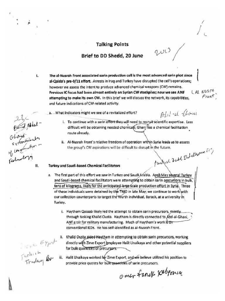 A leaked Pentagon/DIA assessment of the chemical warfare capability of Al Qaeda in Syria, known as al-Nusra, from June 20, 2013. Made public by Seymour Hersh in September 2023.