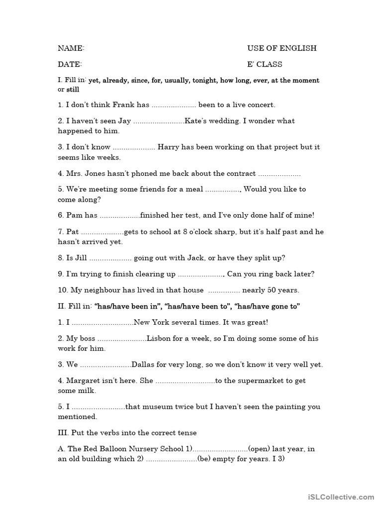 II. Fill in: “has/have been in”, “has/have been to”, “has/have gone to”