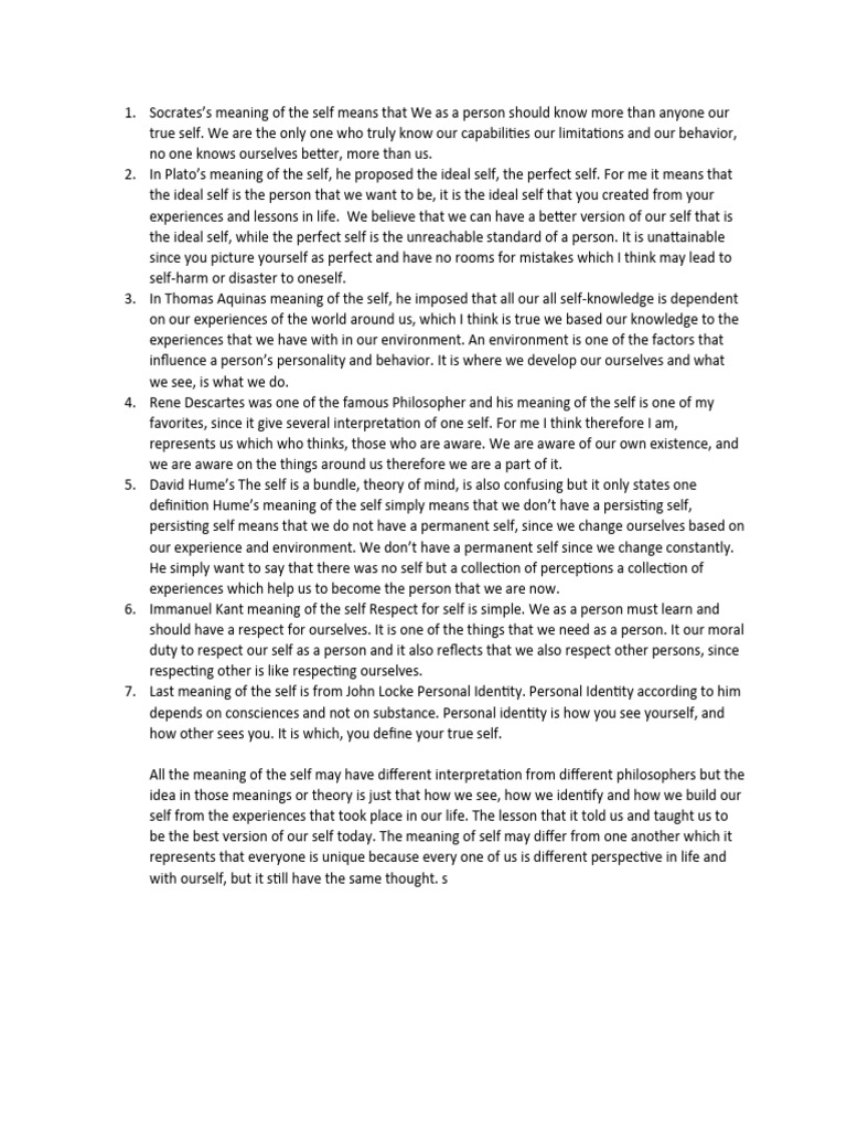 2. In Plato’s meaning of the self, he proposed the ideal self, the perfect self. For me it means that