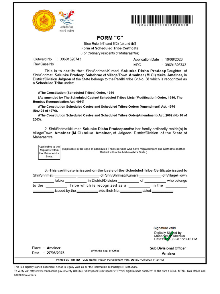 Printed By OMTID : VLE Name :Pravin Purushottam Patil, Date:27/08/2023 11:21PM