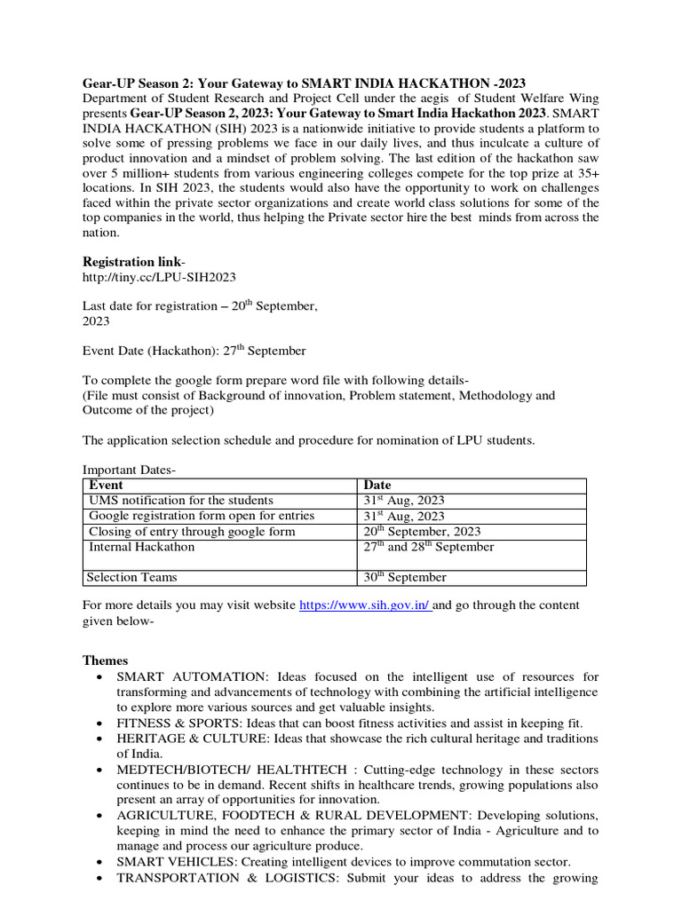 locations. In SIH 2023, the students would also have the opportunity to work on challenges
