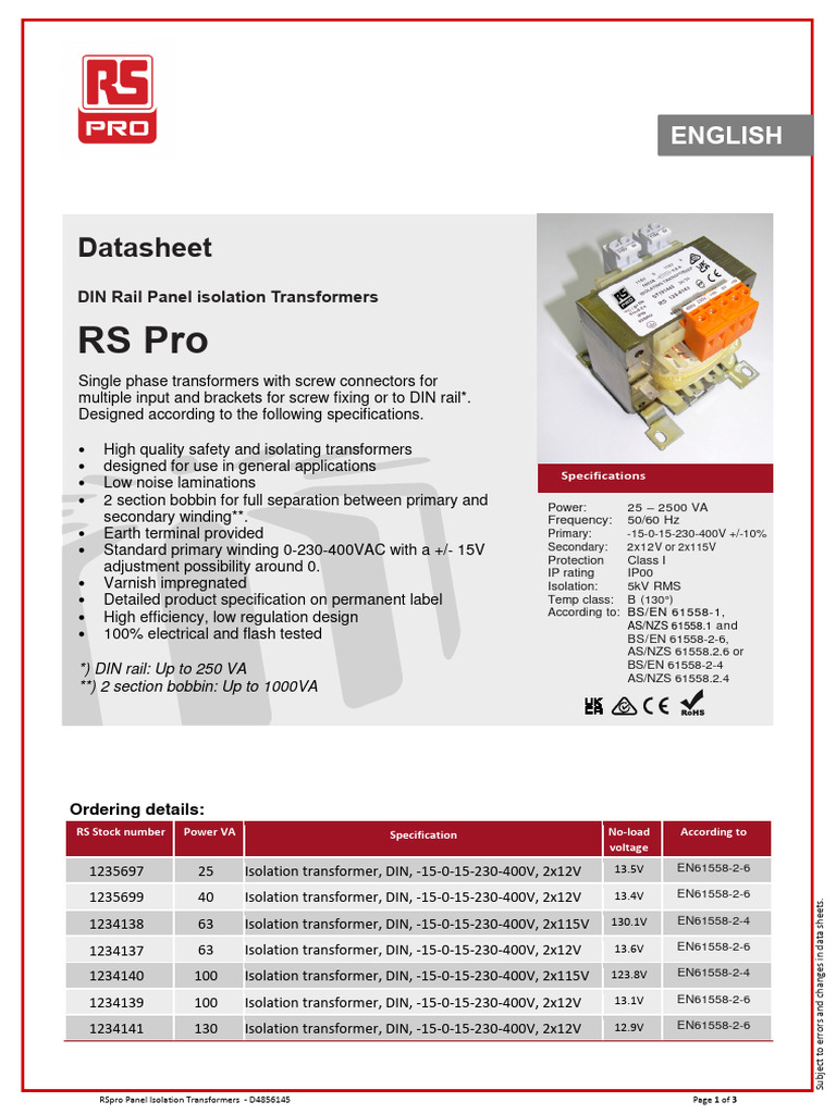 RSpro Panel Isolation Transformers - D4856145 Page 1 of 3