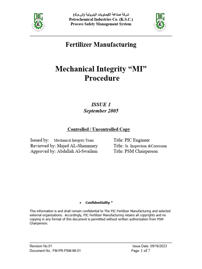 Mechanical integrity procedure shall cover all equipment in plants within PIC Fertilizer