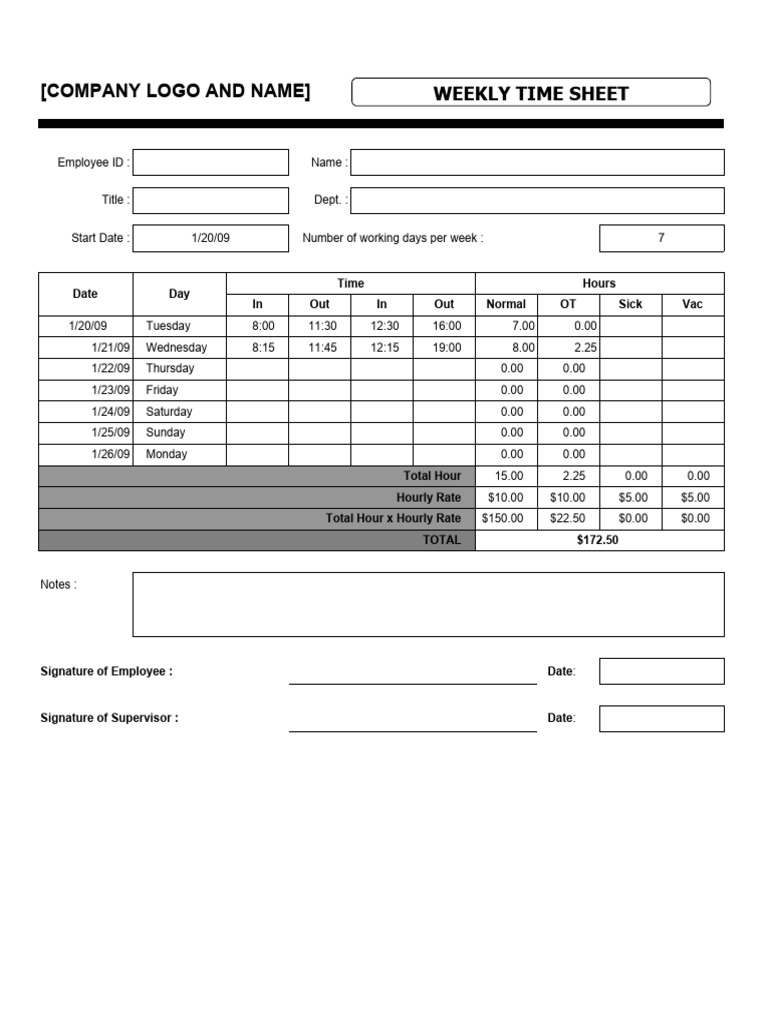 Start Date : 1/20/09 Number of working days per week : 7