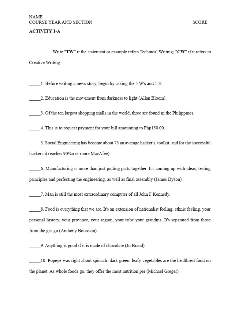 Write "TW” if the statement or example refers Technical Writing; "CW" if it refers to