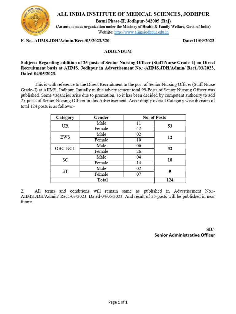 Grade–I) at AIIMS, Jodhpur. Initially in this advertisement total 99-Posts of Senior Nursing Officer was