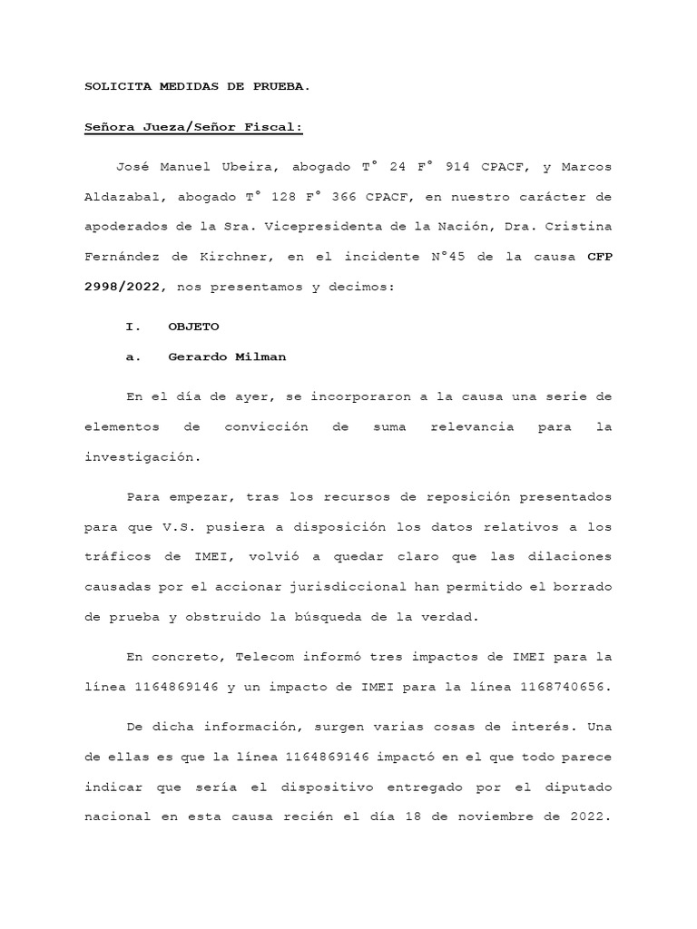 En el día de ayer, se incorporaron a la causa una serie de elementos de convicción de suma relevancia para la investigación. Para empezar, tras los recursos de reposición presentados para que V.S. pusiera a disposición los datos relativos a los tráficos de IMEI, volvió a quedar claro que las dilaciones causadas por el accionar jurisdiccional han permitido el borrado de prueba y obstruido la búsqueda de la verdad. En concreto, Telecom informó tres impactos de IMEI para la línea 1164869146 y un impacto de IMEI para la línea 1168740656. De dicha información, surgen varias cosas de interés. Una de ellas es que la línea 1164869146 impactó en el que todo parece indicar que sería el dispositivo entregado por el diputado nacional en esta causa recién el día 18 de noviembre de 2022.