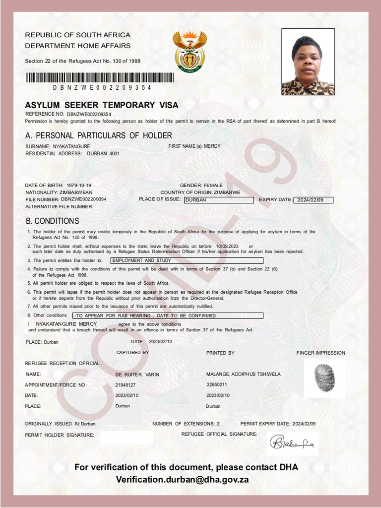 ORIGINALLY ISSUED IN: Durban NUMBER OF EXTENSIONS: 2 PERMIT EXPIRY DATE: 2024/02/09