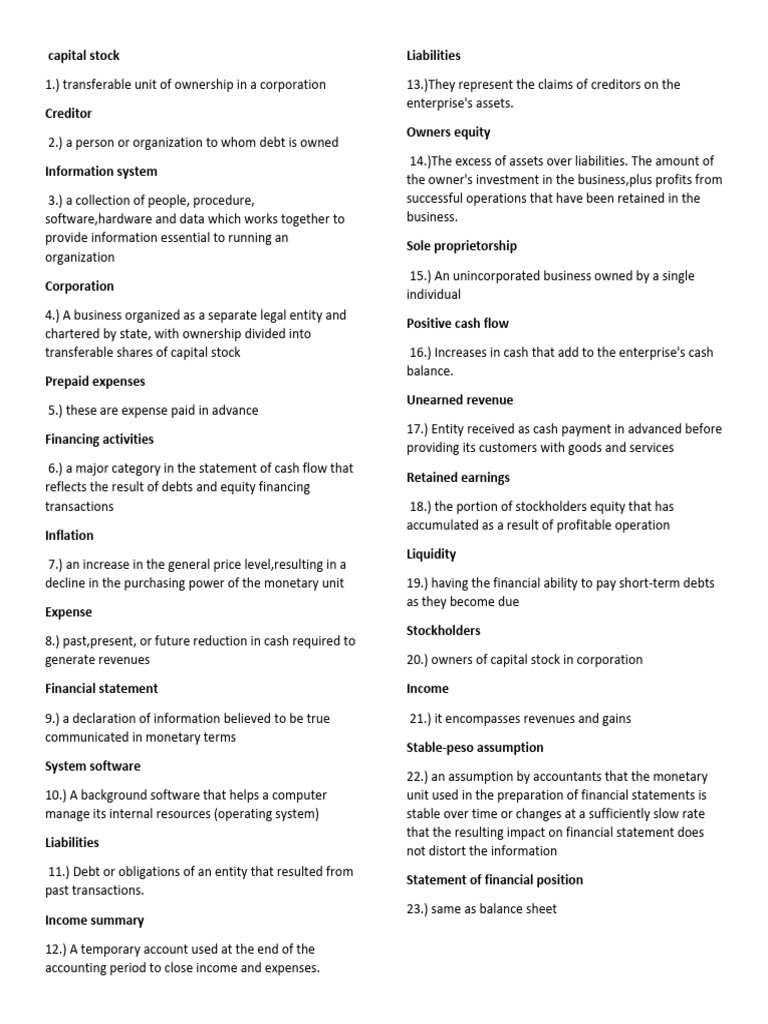 1.) transferable unit of ownership in a corporation 13.)They represent the claims of creditors on the