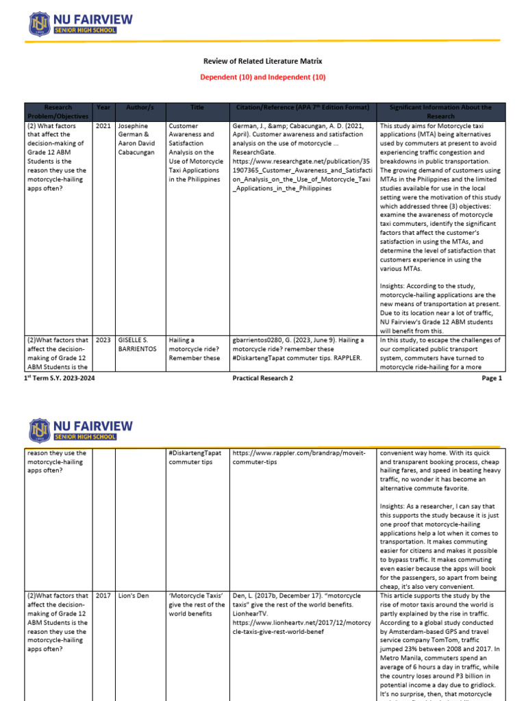 Research Working Title: The Usage of Motorcycle-Hailing Applications and Its Factors Affecting the Decision-Making of Grade 12 ABM Students at NU