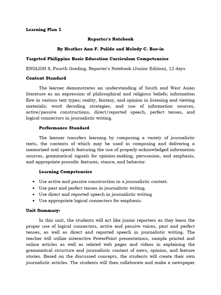 ENGLISH 8, Fourth Grading. Reporter's Notebook (Junior Edition), 12 days