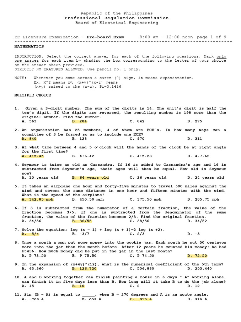 EE Licensure Examination – Pre-board Exam 8:00 am – 12:00 noon page 1 of 9