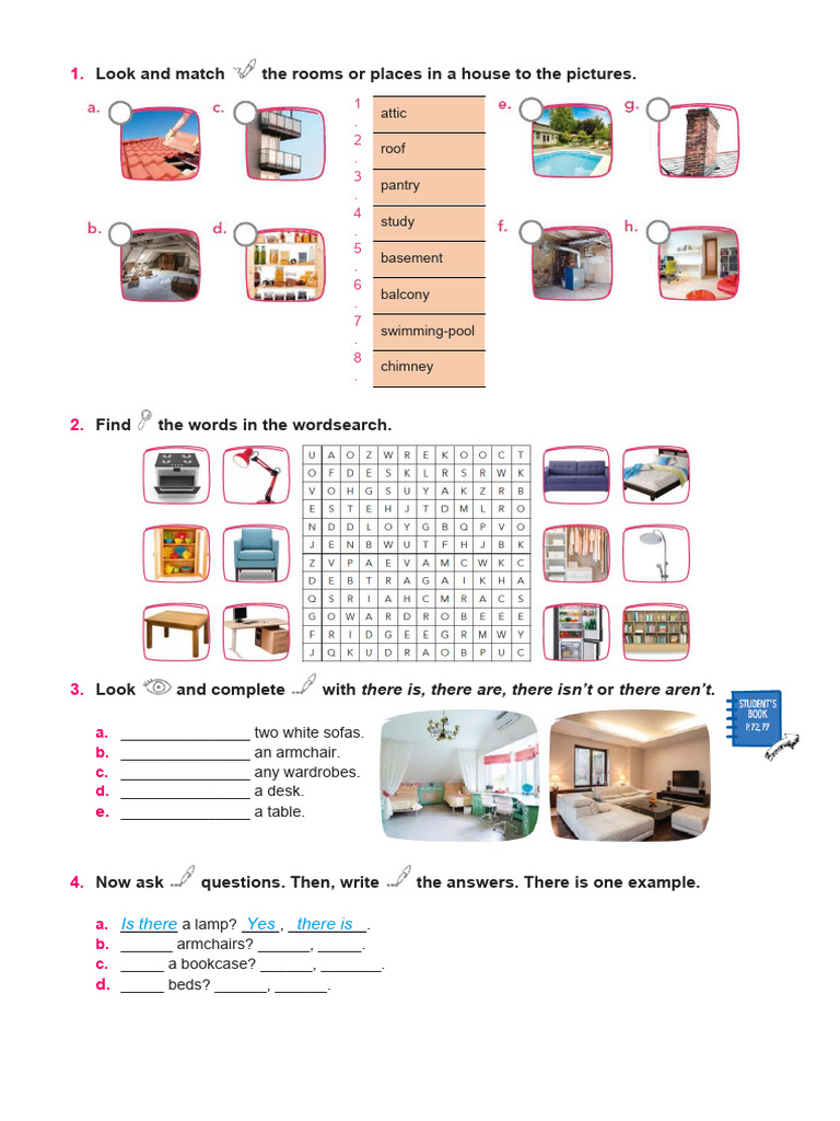 3. Look and complete with there is, there are, there isn’t or there aren’t.