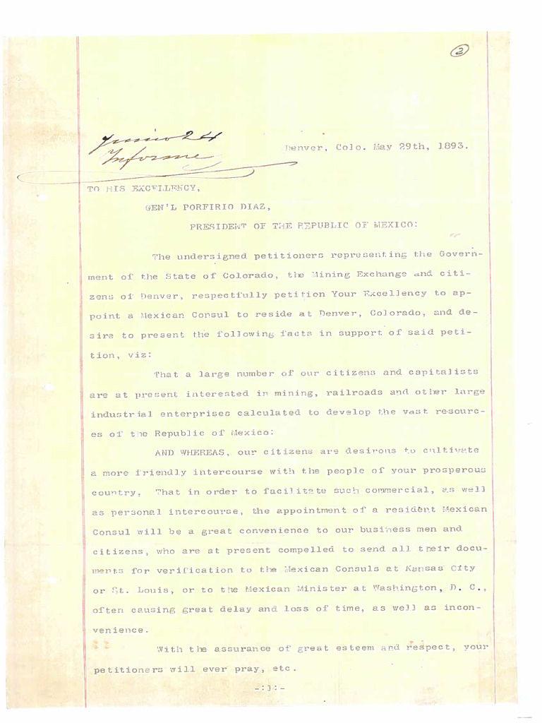 One hundred and thirty years ago, a group of business leaders in Denver wrote a letter to Mexico's President Porfirio Diaz, requesting the appointment of a Mexican Consul General in Denver.