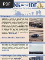 Hundreds of Palestinians participate in violent riots - About 300 Palestinians participated in an extremely violent riot near the village of Qusra, along with 200 at Qalandiya and 150 by Halamish. READ MORE Increased alertness: Hamas intentions for another terrorist attack - IDF received concrete information about another terrorist attack at the Israel-Egypt border by Hamas in the immediate future. READ MORE he IDF, General Security Service and Police have successfully T thwarted a terrorist bombing in Jerusalem - Information released this month reported that security forces have successfully thwarted a terrorist bombing in Jerusalem at the last minute, after a suicide bomber had already been inserted into the city. Joint operations with the IDF have brought to the apprehension of 13 terrorist cells, and around 100 terrorists. . READ MORE irst implementations following inquiries into the Itamar F terrorist attack - Changes in sector defense in the Central Command, implemented after the terrorist attack which took the lives of five members of the Fogel family, include greater cooperation between the IDF and civilian security elements and an increase in physical obstacles. READ MORE