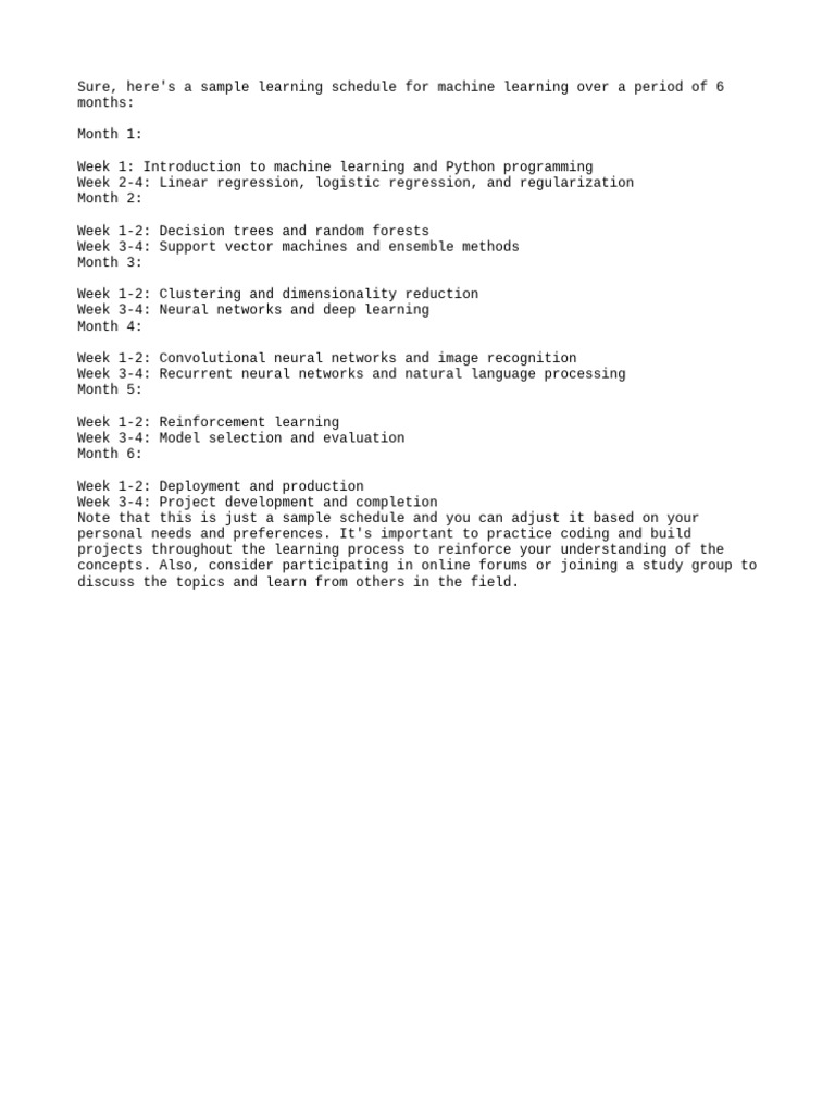 Sure, here's a sample learning schedule for machine learning over a period of 6