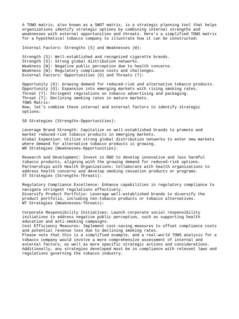 weaknesses with external opportunities and threats. Here's a simplified TOWS matrix