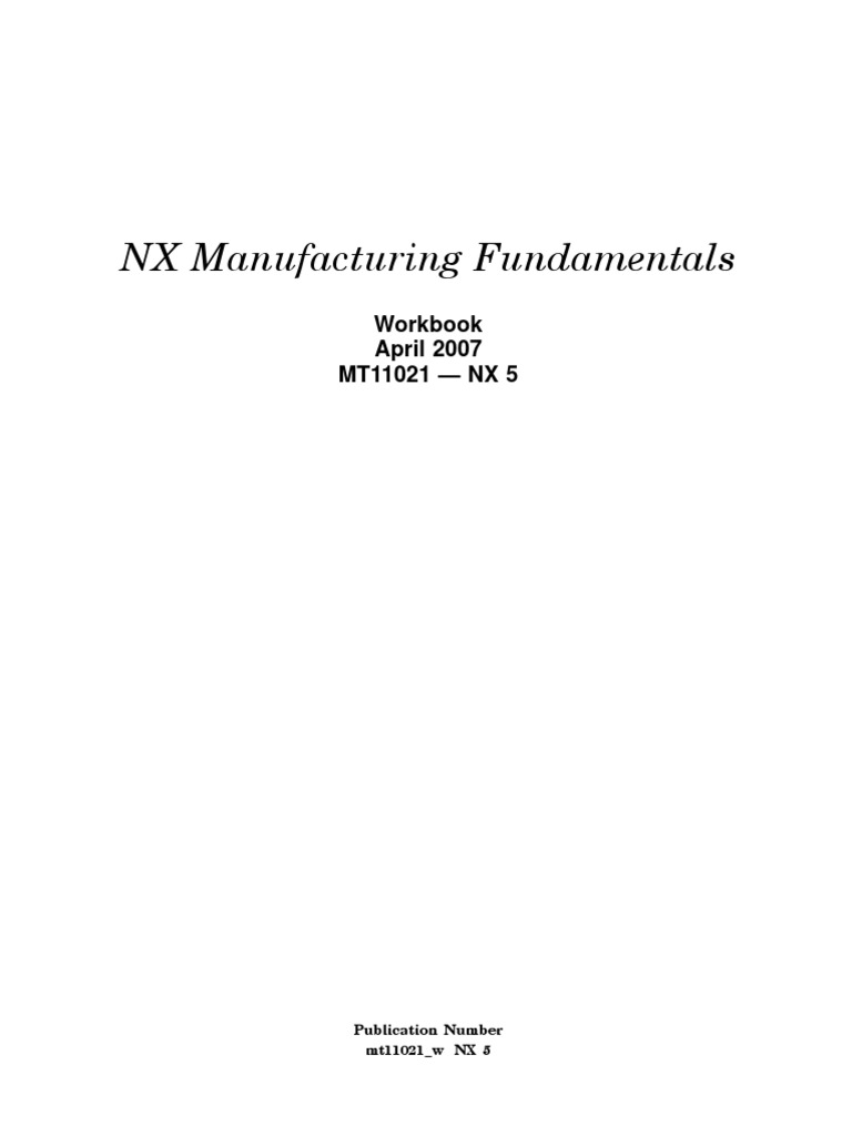 The Manufacturing Process . . . . . . . . . . . . . . . . . . . . . . . . . . . . . . . . 1-1 Create a Clamp . . . . . . . . . . . . . . . . . . . . . . . . . . . . . . . . . . . . . . . . . . 2-1 Fixture Assembly . . . . . . . . . . . . . . . . . . . . . . . . . . . . . . . . . . . . . . . . 3-1 Create a Setup Sheet . . . . . . . . . . . . . . . . . . . . . . . . . . . . . . . . . . . . . 4-1 Set the Machining Environment . . . . . . . . . . . . . . . . . . . . . . . . . . . . 5-1 Set the MCS, Part, Blank, Check Geometry and Mill Method . . . . . 6-1 Create a Cavity Milling operation. . . . . . . . . . . . . . . . . . . . . . . . . . . 7-1 Visualize and Verify. . . . . . . . . . . . . . . . . . . . . . . . . . . . . . . . . . . . . . . 8-1 Face Milling . . . . . . . . . . . . . . . . . . . . . . . . . . . . . . . . . . . . . . . . . . . . . 9-1 Drilling. . . . . . . . . . . . . . . . . . . . . . . . . . . . . . . . . . . . . . . . . . . . . . . . 10-1 Post Processing and Shop Documentation. . . . . . . . . . . . . . . . . . . 11-1