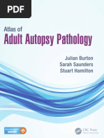 Recommended reading list at the end of the book. A short summary of the basic techniques is given below. 1 An incision is made from the larynx to the pubis. The upper margin may be extended on each side of the neck to form a Y incision. The extra exposure this brings is useful in cases of neck injury or in children. 2 The skin on the front of the chest and abdomen is reected laterally and the anterior abdominal wall is opened, taking care not to damage the intestines. The intestines are removed by cutting through the third part of the duodenum as it emerges from the retroperitoneum and then dissecting the small and large bowel from the mesentery. 3 The ribs are sawn through in a line from the lateral costal margin to the inner clavicle and the front of the chest is removed. 4 The tongue and pharynx are mobilized by passing a knife around the oor of the mouth close to the mandible. These are then removed downward as the neck structures are dissected off the cervical spine. 5 The axillary vessels are divided at the clavicles, and the oesophagus and the aorta are dissected from the thoracic spine as the tongue continues to be pulled forwards and downwards. 6 The lateral and posterior attachments of the diaphragm are cut through close to the chest cavity wall and then the aorta is dissected off the lower thoracic and lumbar spine. 7 Finally, the iliac vessels and the ureters can be bisected at the level of the pelvic rim and the organs will then be free of the body and can be taken to a table for dissection. 8 The pelvic organs are examined in situ or they can be removed from the pelvis for examination. 9 The scalp is incised coronally and the aps reected forwards and backwards. The skull-cap is carefully sawn through and removed, leaving the dura intact. This is then incised and the brain removed by gentle traction of the frontal lobes while cutting through the cranial nerves, the tentorium and the upper spinal cord. 10 The organs are dissected in a good light with adequate water to maintain an essentially bloodfree area. Although every pathologist has his or her own order of dissection, a novice would do well to stick to the following order so that nothing is omitted: tongue, carotid arteries, oesophagus, larynx, trachea, thyroid, lungs, great vessels, heart, stomach, intestines, adrenals, kidneys, spleen, pancreas, gall