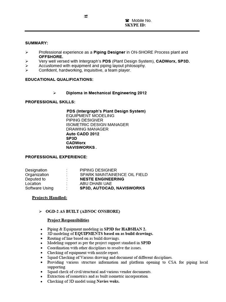 Very well versed with Intergraph’s PDS (Plant Design System), CADWorx, SP3D.