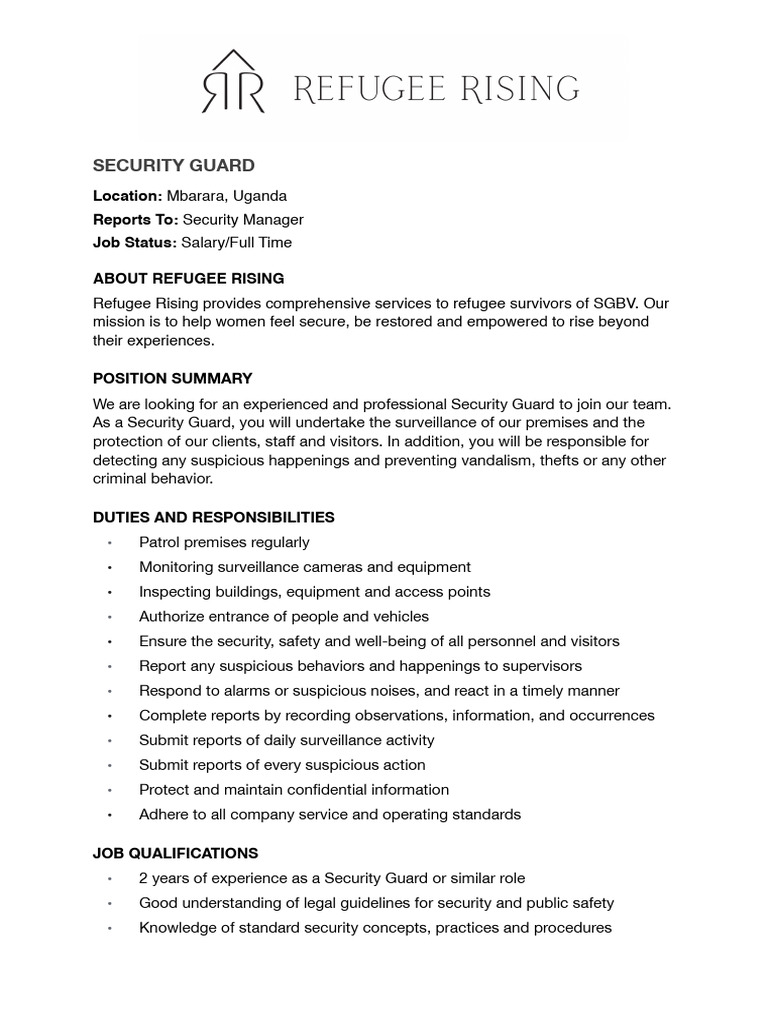 careers@refugeerising.org with ‘Security Guard’ in the subject line. Please indicate