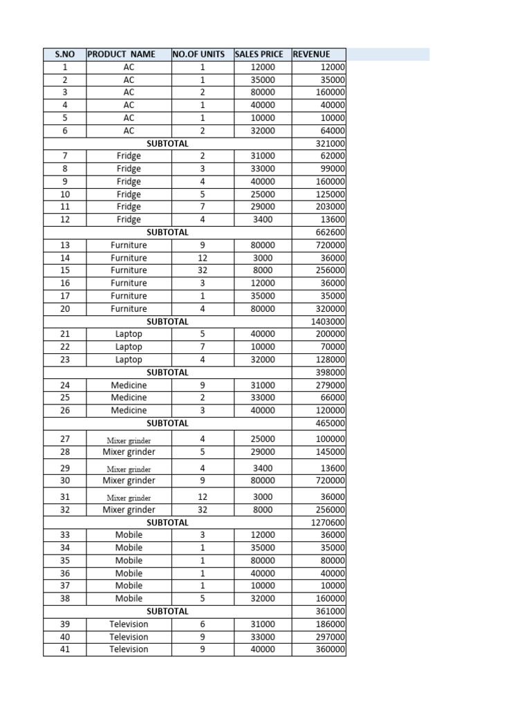 14 Furniture 12 3000 36000