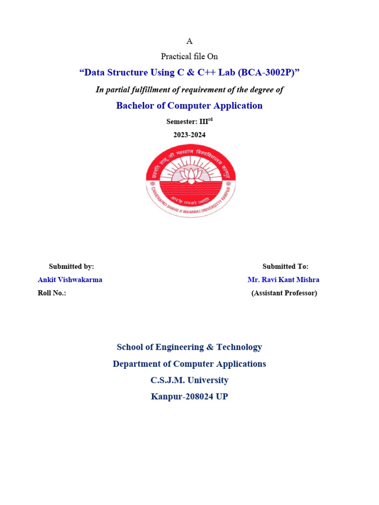 prepared the practical file of “Data Structure Using C & C++ Lab (BCA-3002P)” in partial