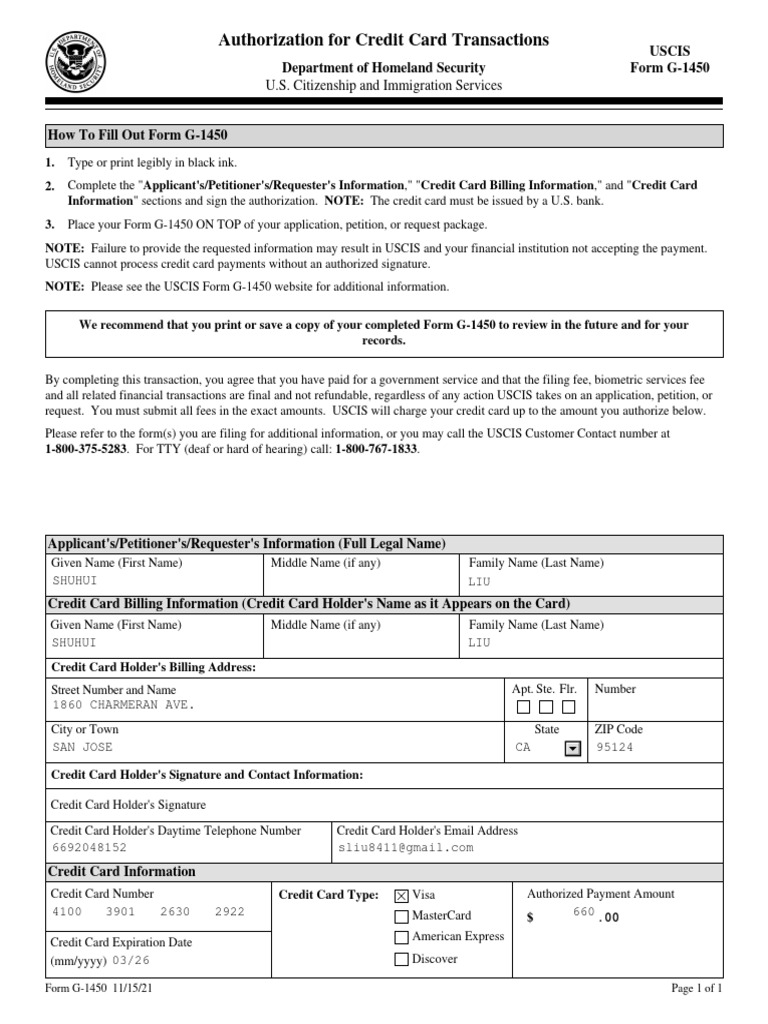 We recommend that you print or save a copy of your completed Form G-1450 to review in the future and for your