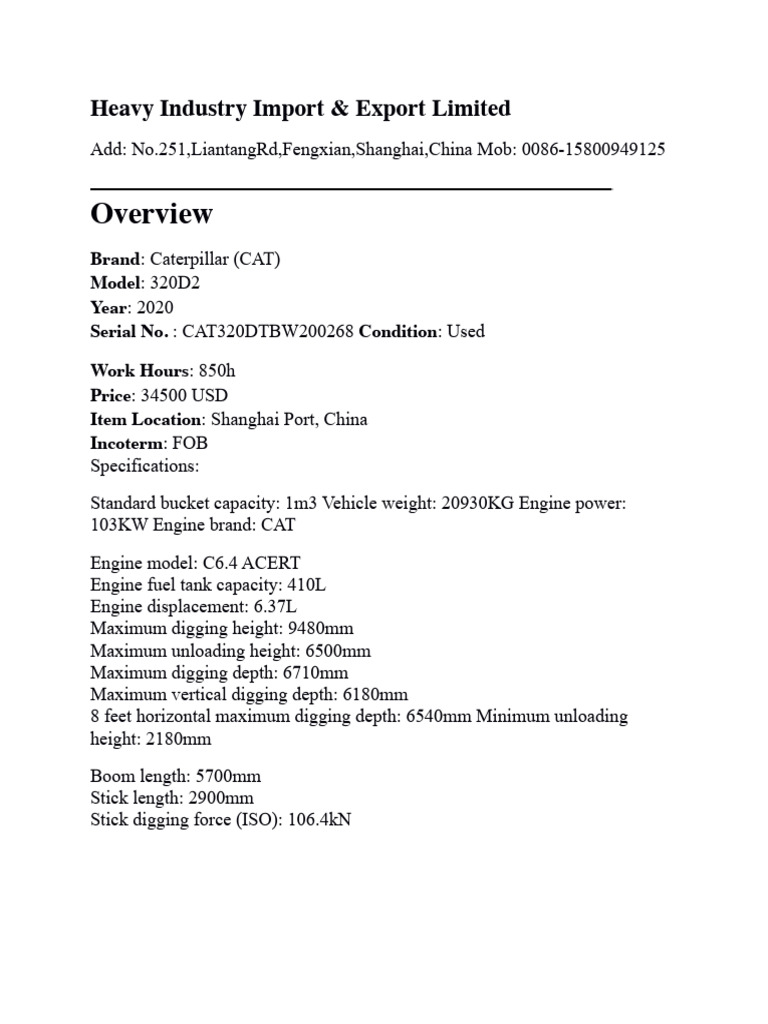 Standard bucket capacity: 1m3 Vehicle weight: 20930KG Engine power: