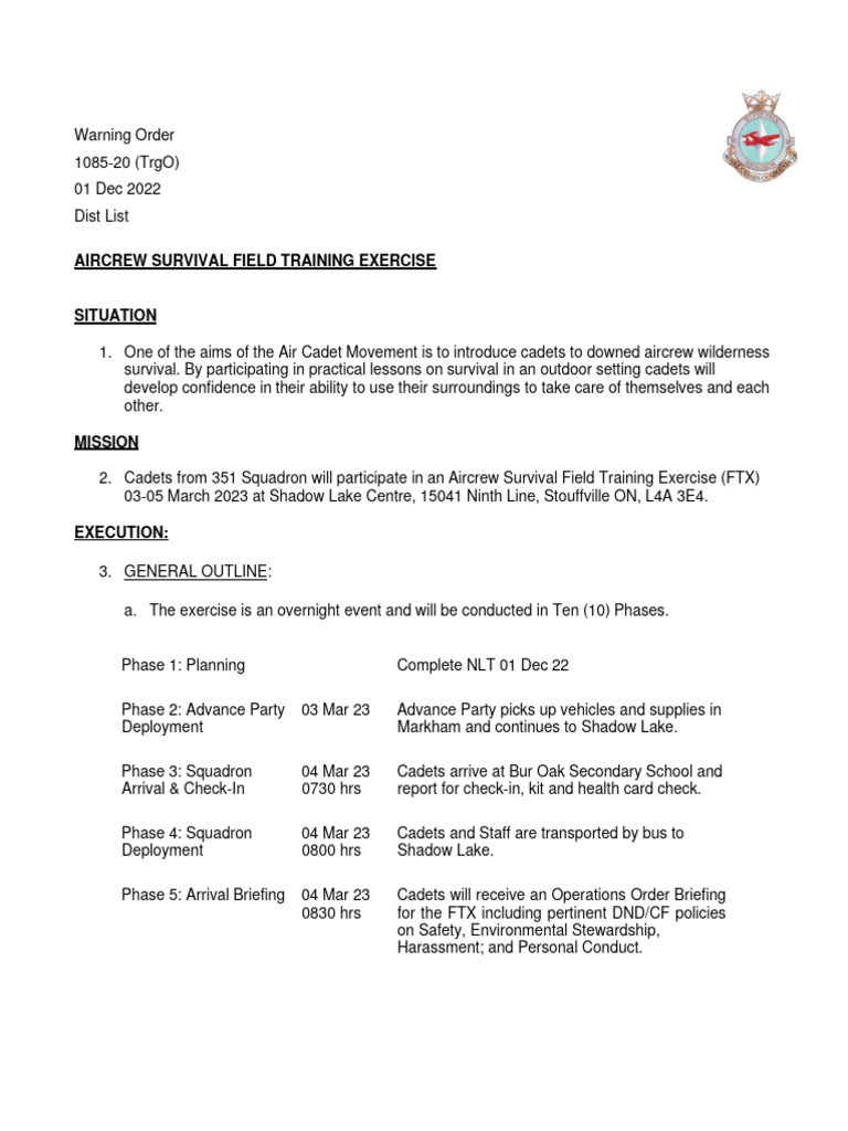 2. Cadets from 351 Squadron will participate in an Aircrew Survival Field Training Exercise (FTX)