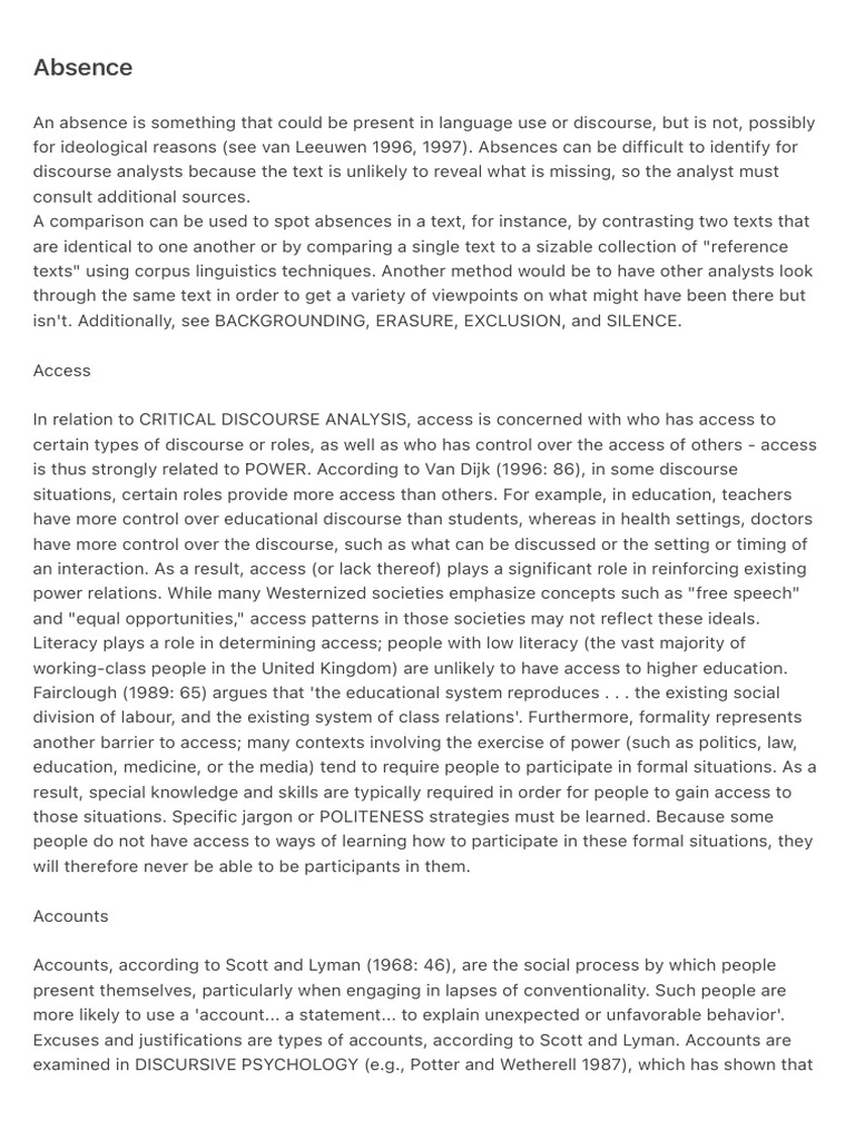 for ideological reasons (see van Leeuwen 1996, 1997). Absences can be difficult to identify for
