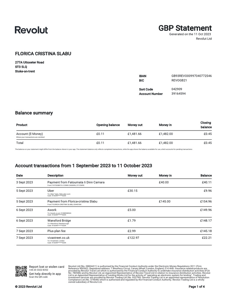 5 Sept 2023 Payment from Florica-cristina Slabu £145.00 £154.96