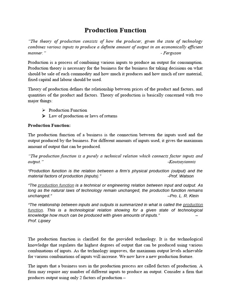 Where Q is the level of output and a, b, c, -----------, z are inputs like land, labour and capital.