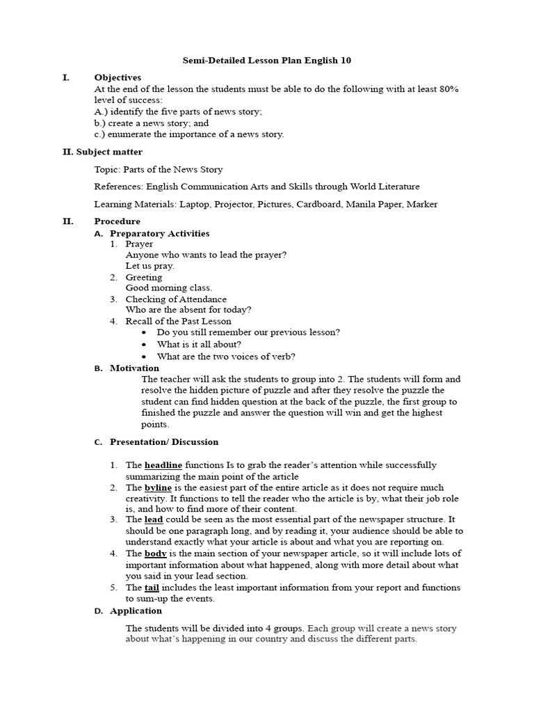 Semi-Detailed Lesson Plan English 10