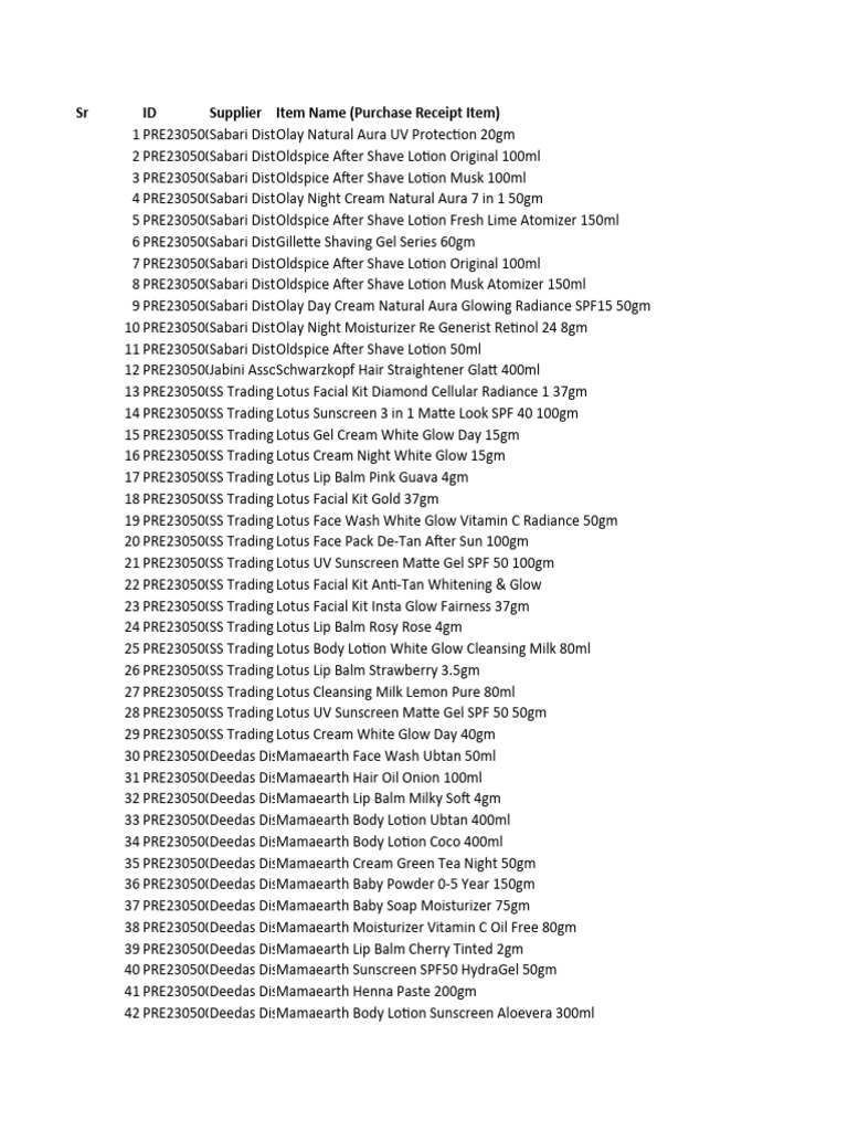 Sr ID Supplier Item Name (Purchase Receipt Item)