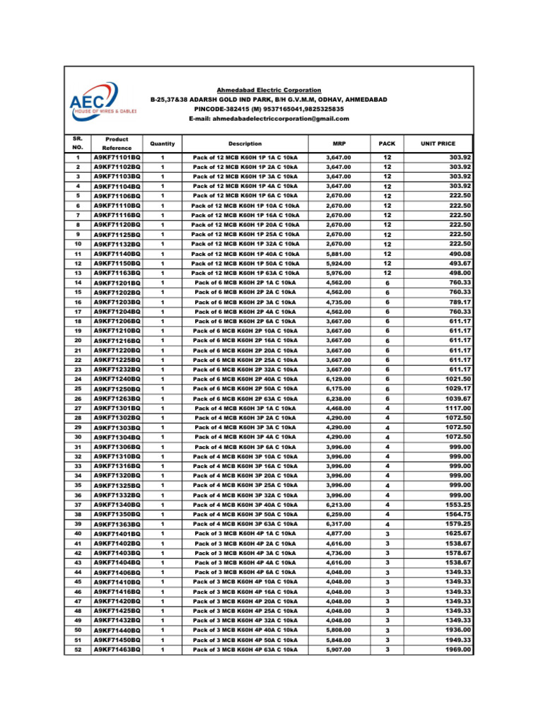 51 A9KF71450BQ 1 Pack of 3 MCB K60H 4P 50A C 10kA 5,848.00 3 1949.33
