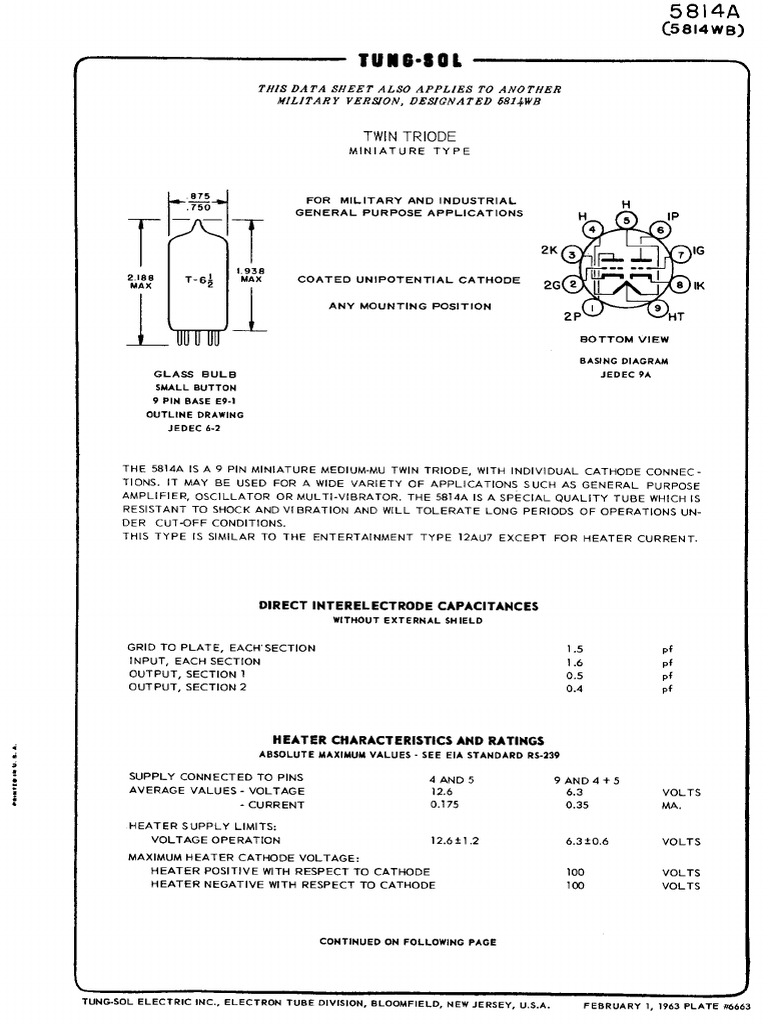 TUNG-SOL ELECTRIC INC., ELECTRON TUBE DIVISION, BLOOMFIELD, NEW JERSEY, U.S.A. FEBRUARY 1, 1963 PLATE 664S8I4A