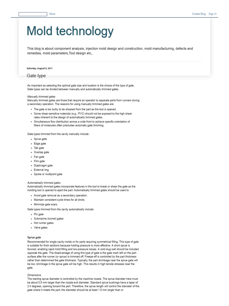 The typical gate size is 80% to 100% of the part thickness up to 3.5 mm and 1.0 to 12 mm wide.