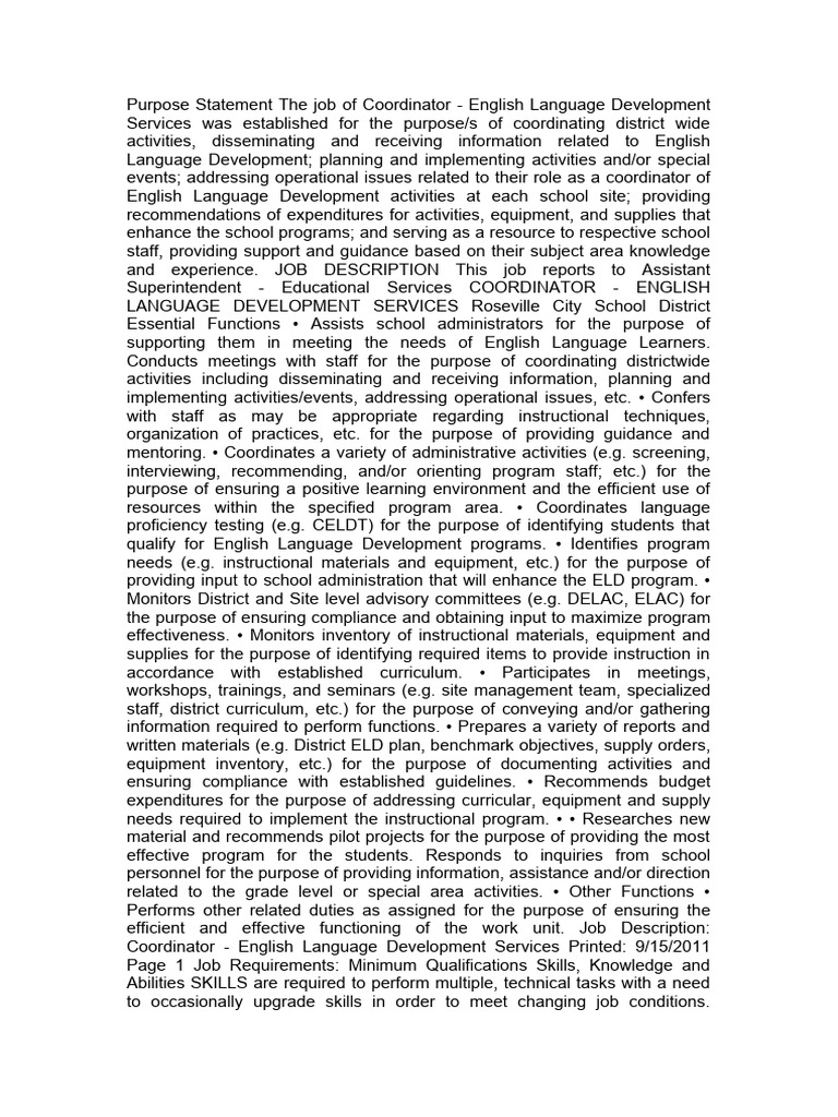 Coordinator - English Language Development Services Printed: 9/15/2011