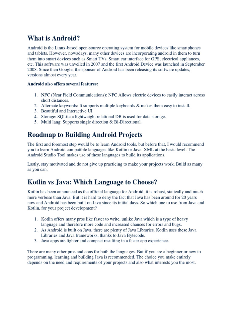 you to learn Android compatible languages like Kotlin or Java, XML at the basic level. The
